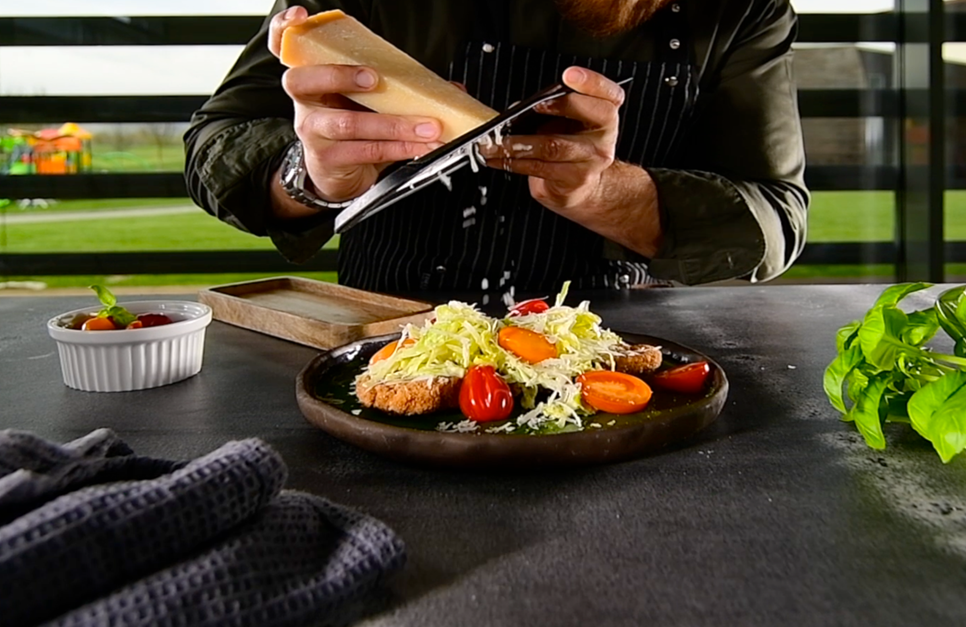 Pentru servire, șnițelul se combină cu un mix de frunze verzi crocante, completate de câteva felii subțiri de parmezan. Dressingul de iaurt, cu puțină zeamă de lămâie și ulei de măsline, completează toate elementele, adăugând prospețime și savoare. Rezultatul este o masă delicioasâ, cu contraste plăcute de textură și gust, care arată sofisticat, dar se pregătește cu un minim de efort. Este una dintre acele rețete la care revii ușor, atunci când vrei ceva rapid, gustos și nutritiv.